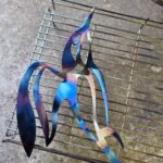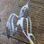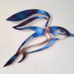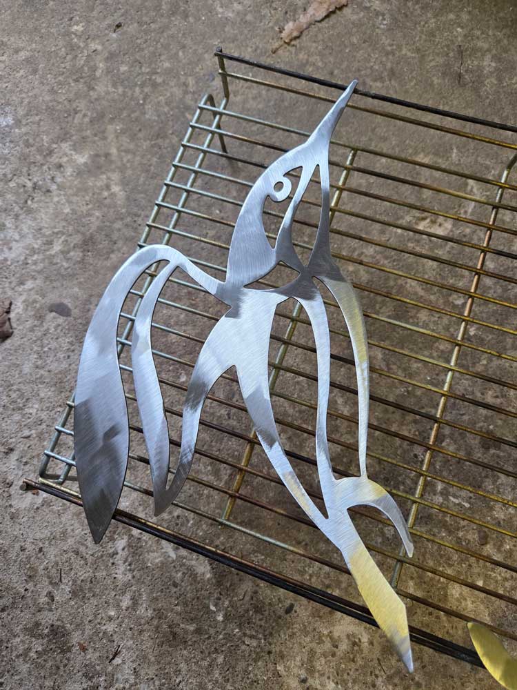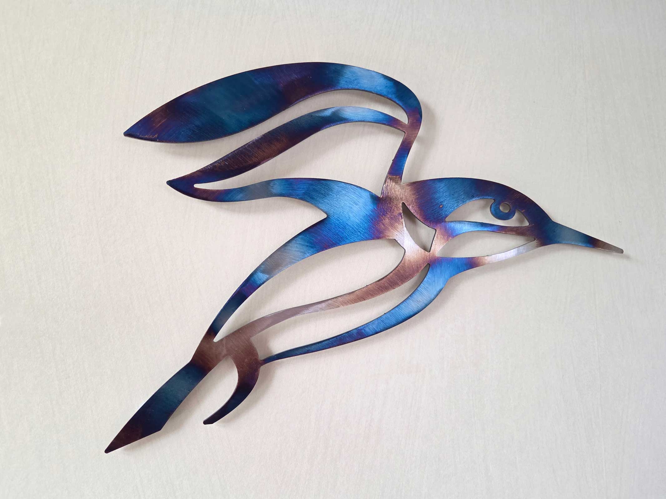 Last autumn I enjoyed watching a kingfisher almost every time I walked along the nearby canal. The flash of blue as they swoop past is really quite incredible. The amazing colour is very cleverly due to light bending magic, or structural colouration, where colour is produced by microscopically structured surfaces fine enough to interfere with visible light, as opposed to from pigments, which is the more conventional approach. I thought the iridescence of their feathers made them an ideal subject for metal art.
