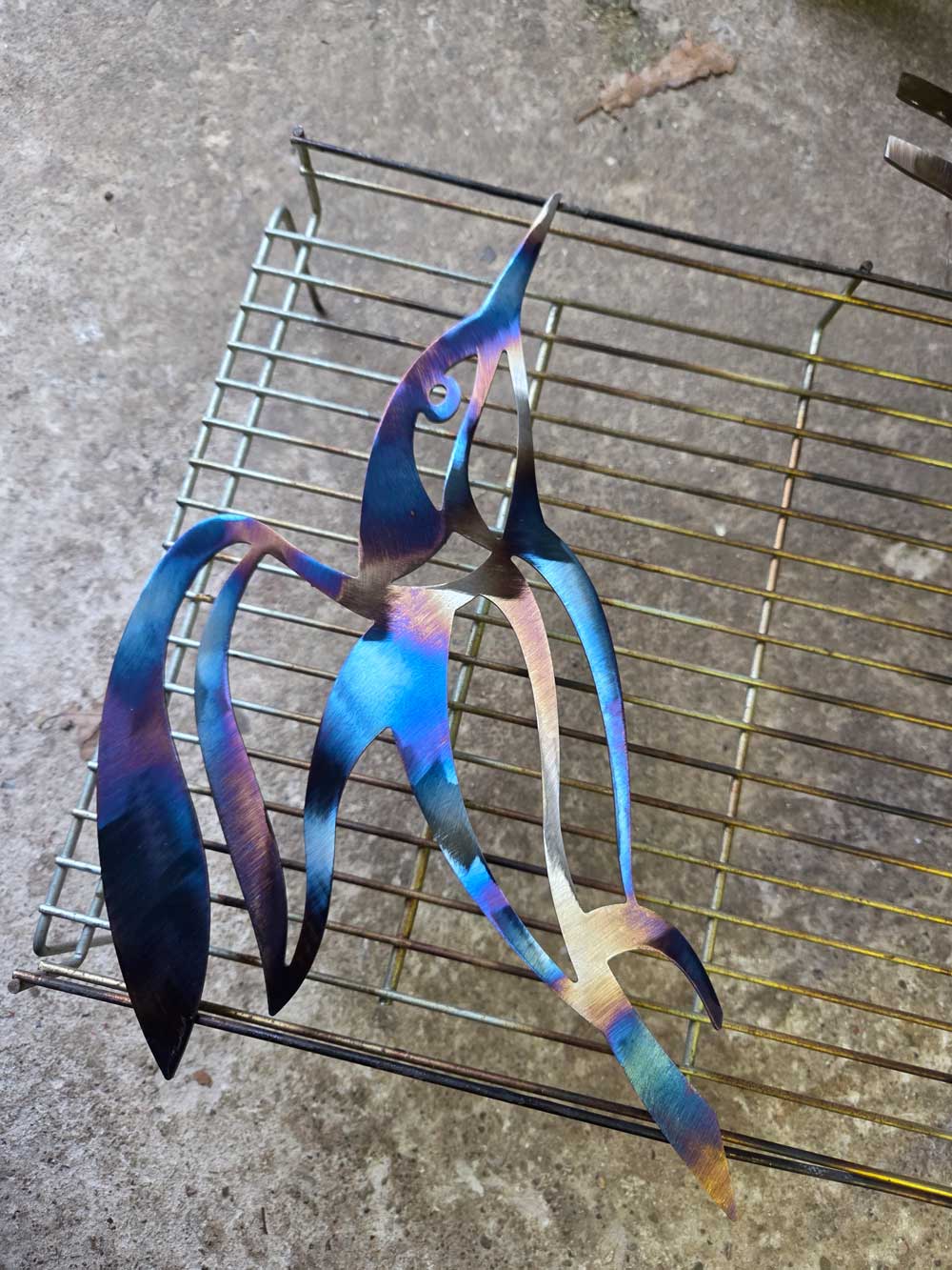 When tempering steel you have to carefully gauge how much heat to apply, and use a light touch. The metal has a time lag as the colours develop, but is also incredibly sensitive to changes in temperature . It’s very easy to heat it a fraction too much and the colours rapidly move from straw to bronze through to purple, blue and pale silver. I tried to match the colours at least approximately to the right areas. I’m quite pleased with the result.