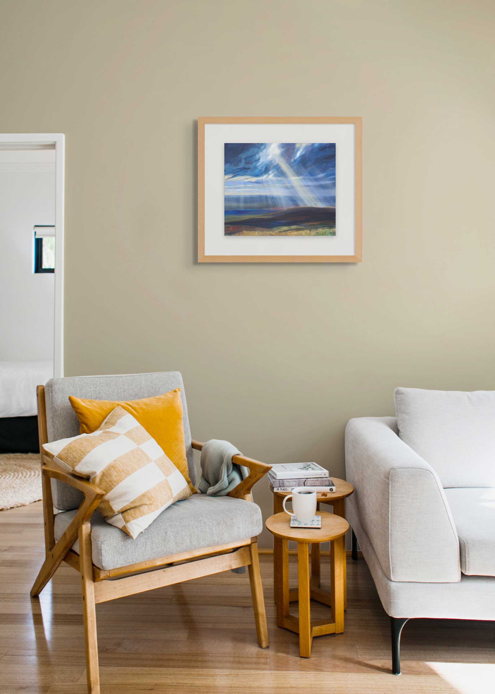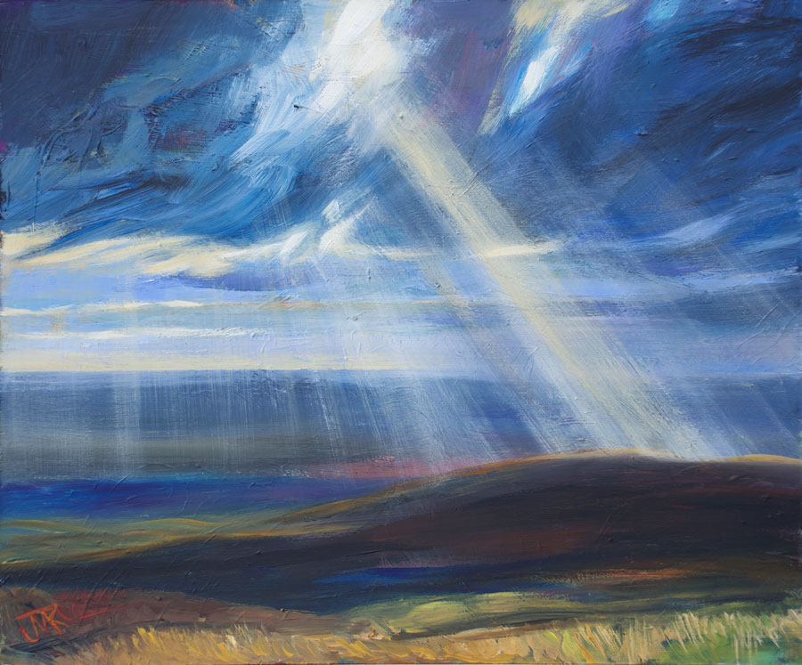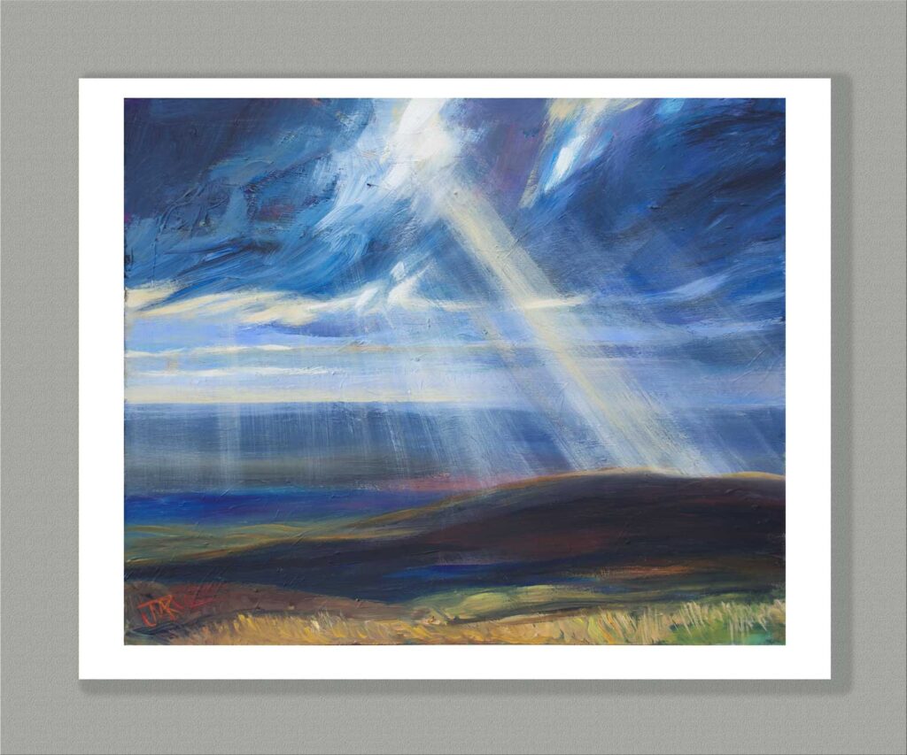 This large limited edition Giclee print is a high quality reproduction of my acrylic painting showing a shaft of sun illuminating Nicky Nook, a small fell near where I live on the edge of the Forest of Bowland in North Lancashire. I love to watch the light and clouds change as the weather sweeps in off the Irish Sea.