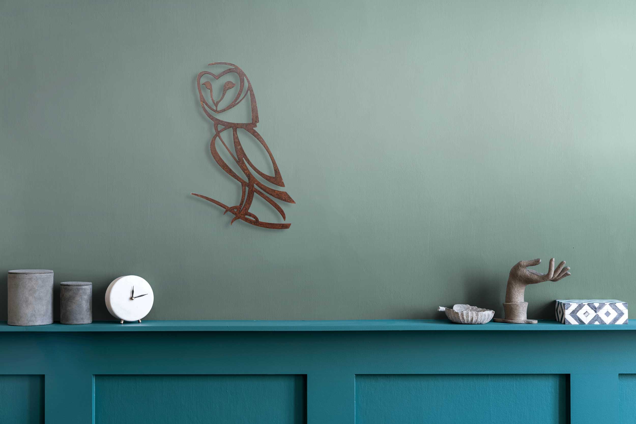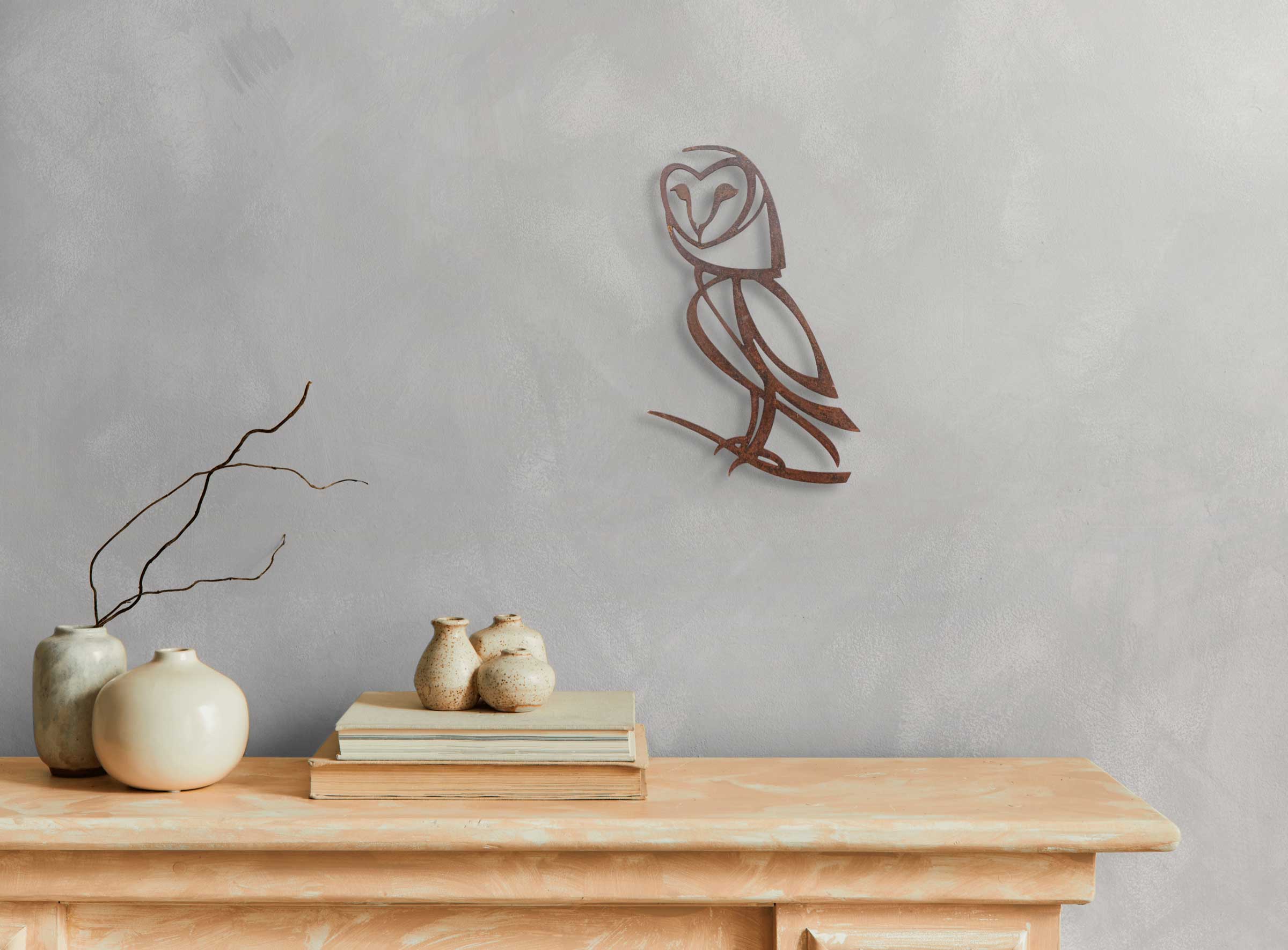 An elegant wall mounted design of a barn owl, suitable for display indoors or outdoors. A perfect gift for bird and wildlife lovers. Made to order.