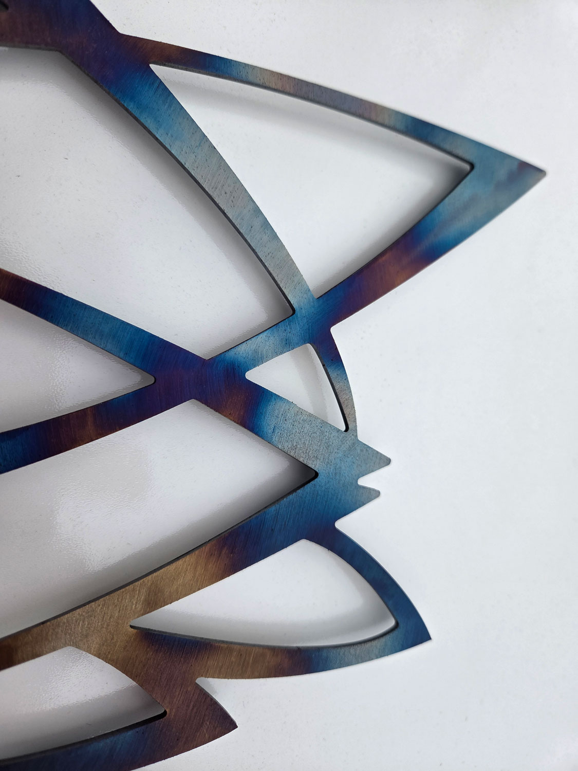 My wall mounted metal art is all made to last from high quality 2 mm steel. To create the beautiful patina on this design I used a gas torch to temper the metal. It’s an amazing process, like painting with fire. Each piece is completely unique. I then apply a layer of clear acrylic spray to seal and protect the surface; otherwise the coloured patina is very susceptible to scratching and corrosion.