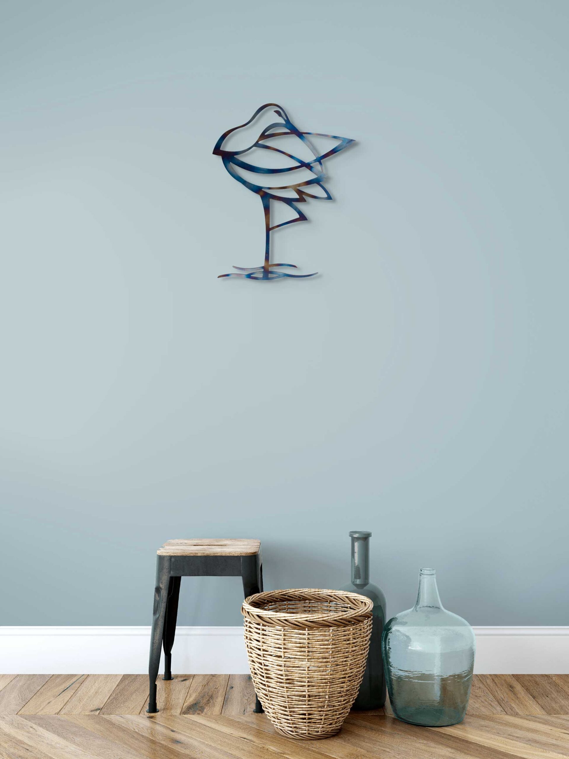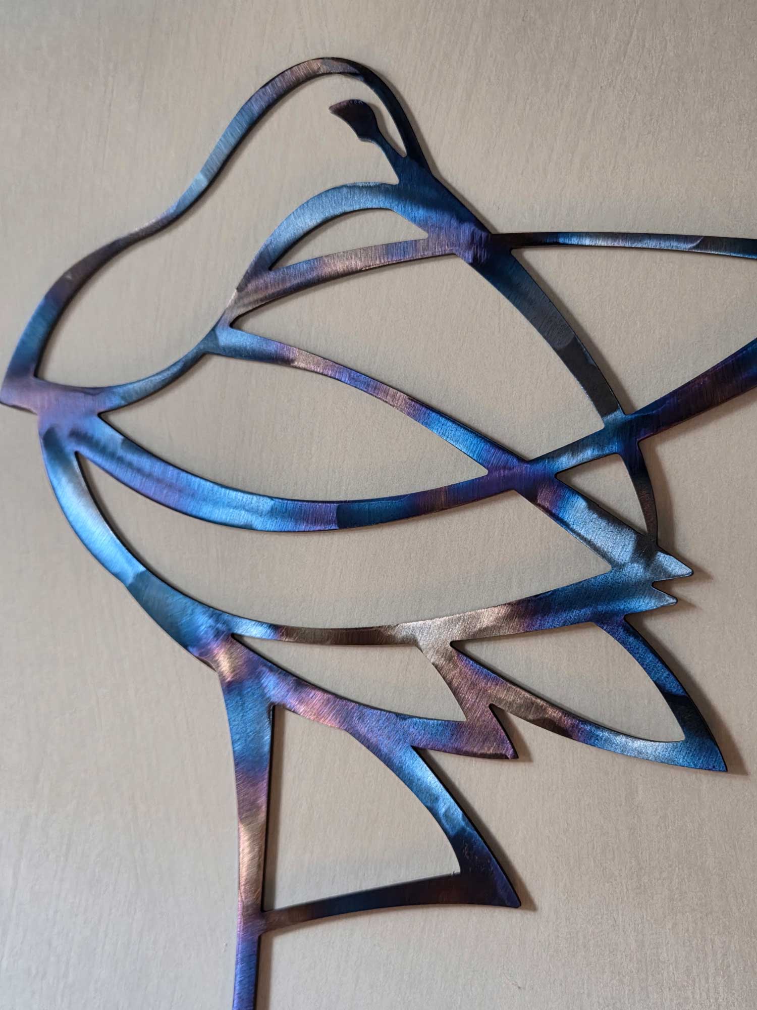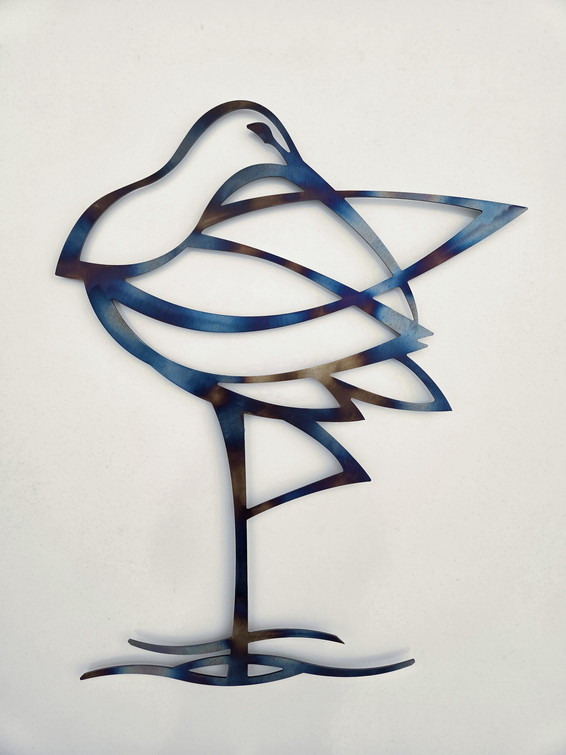 A curlew design made from steel which has been heat tempered to give a beautiful rainbow effect.