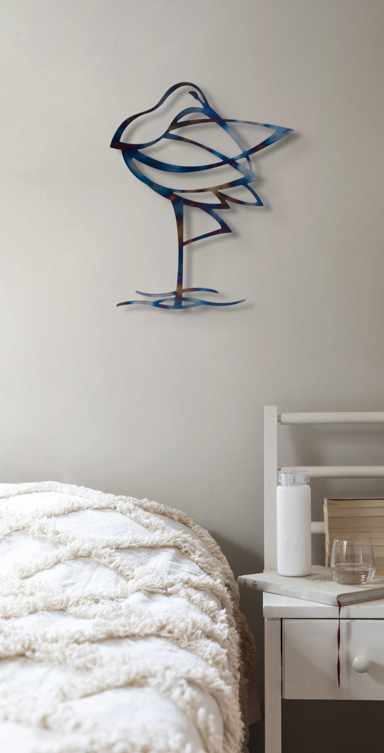 In order to ensure the longevity of the rainbow patina it is recommended to keep my heat treated designs indoors. I also make the curlew design in sealed rusted steel, or stainless steel, both of which are perfectly durable outdoors.