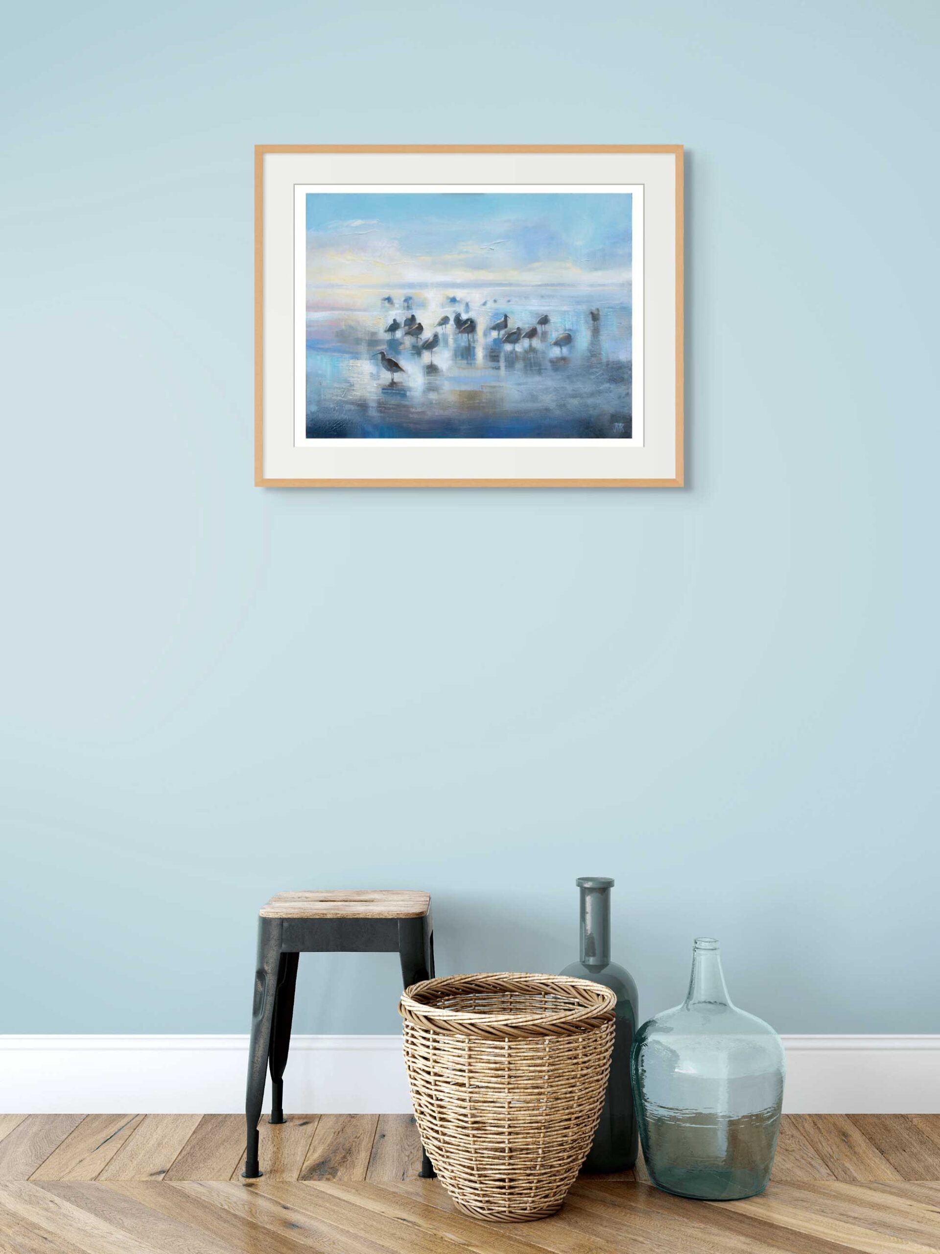 A high quality reproduction of my oil painting showing a flock of curlews on the edge of Morecambe Bay at low tide. In autumn and winter Morecambe Bay is a wonderful place to watch birds, especially on a clear day when the sky is reflected in the shimmering mud.