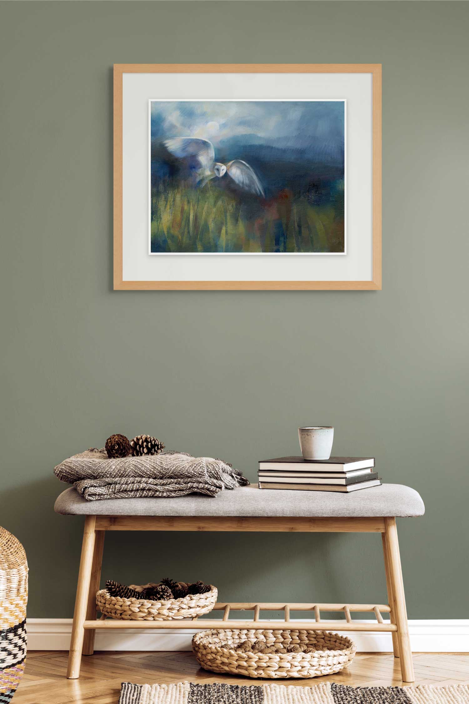 This hand signed fine art print is a high quality reproduction of my oil painting of a barn owl. We are lucky enough to have a resident barn owl who we see quite regularly hunting over the field next to us, and I love the ghostly way it swoops out of the darkness, completely silently. I painted this after an autumn storm, having watched the full Hunter’s Moon rising through the clouds.