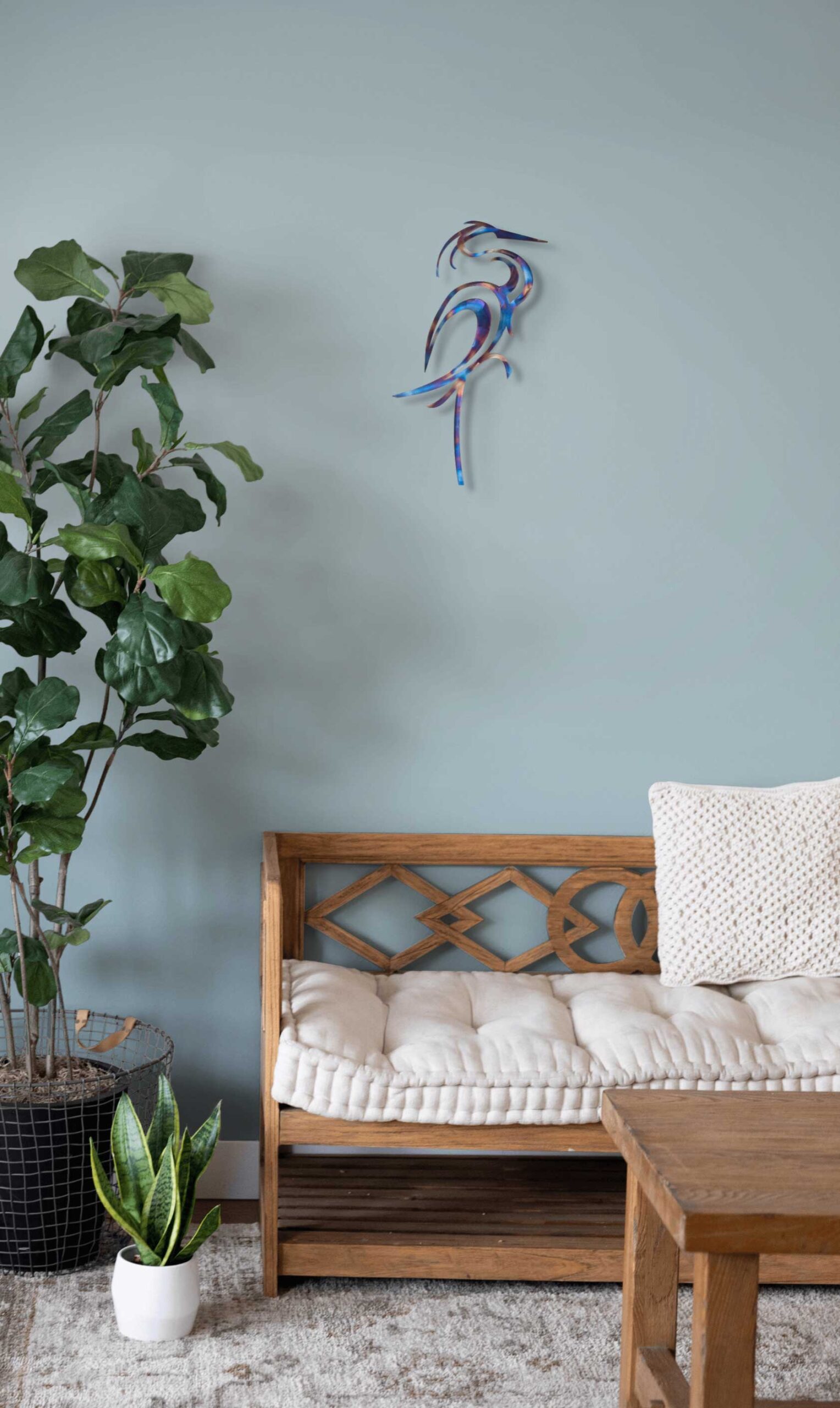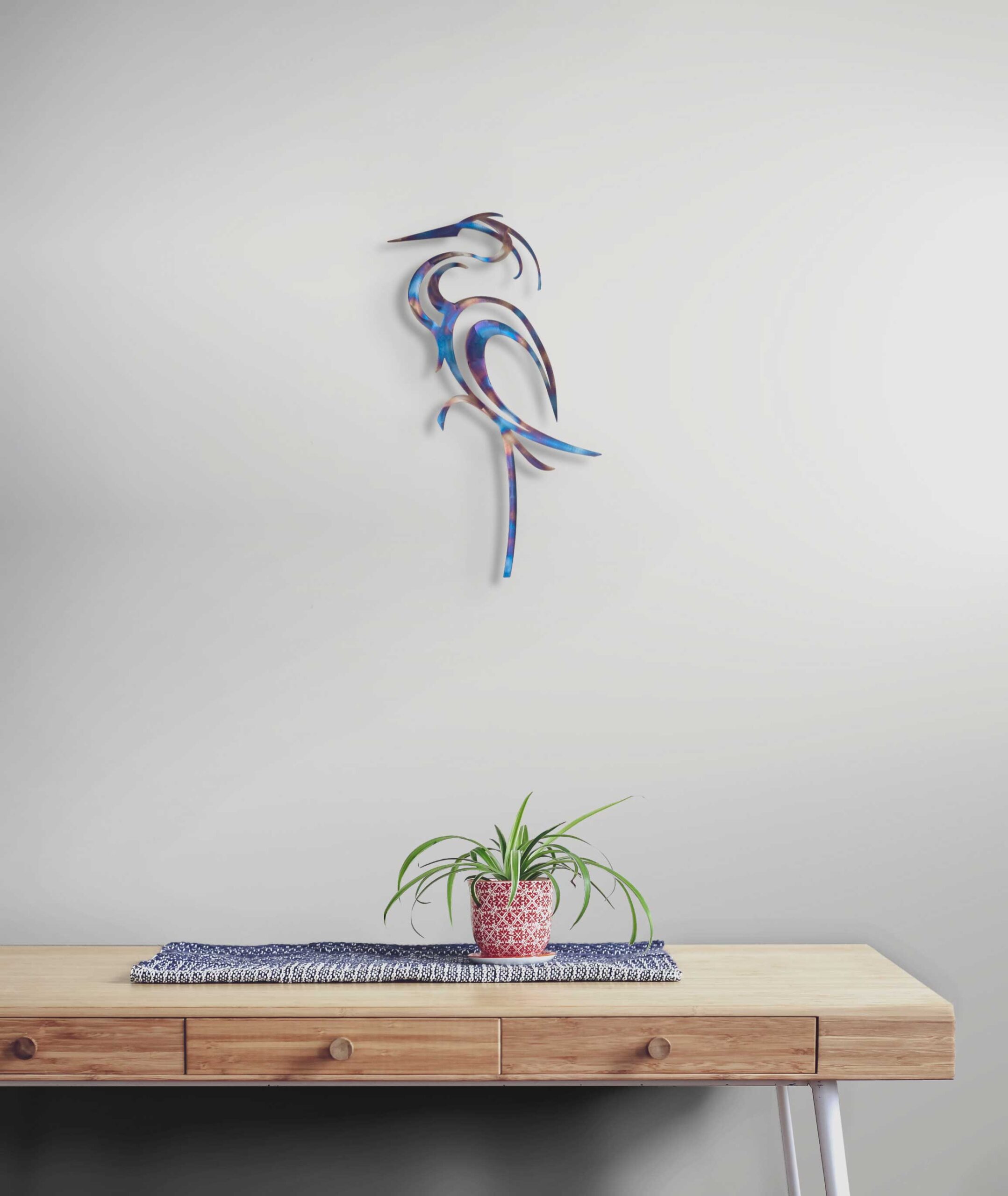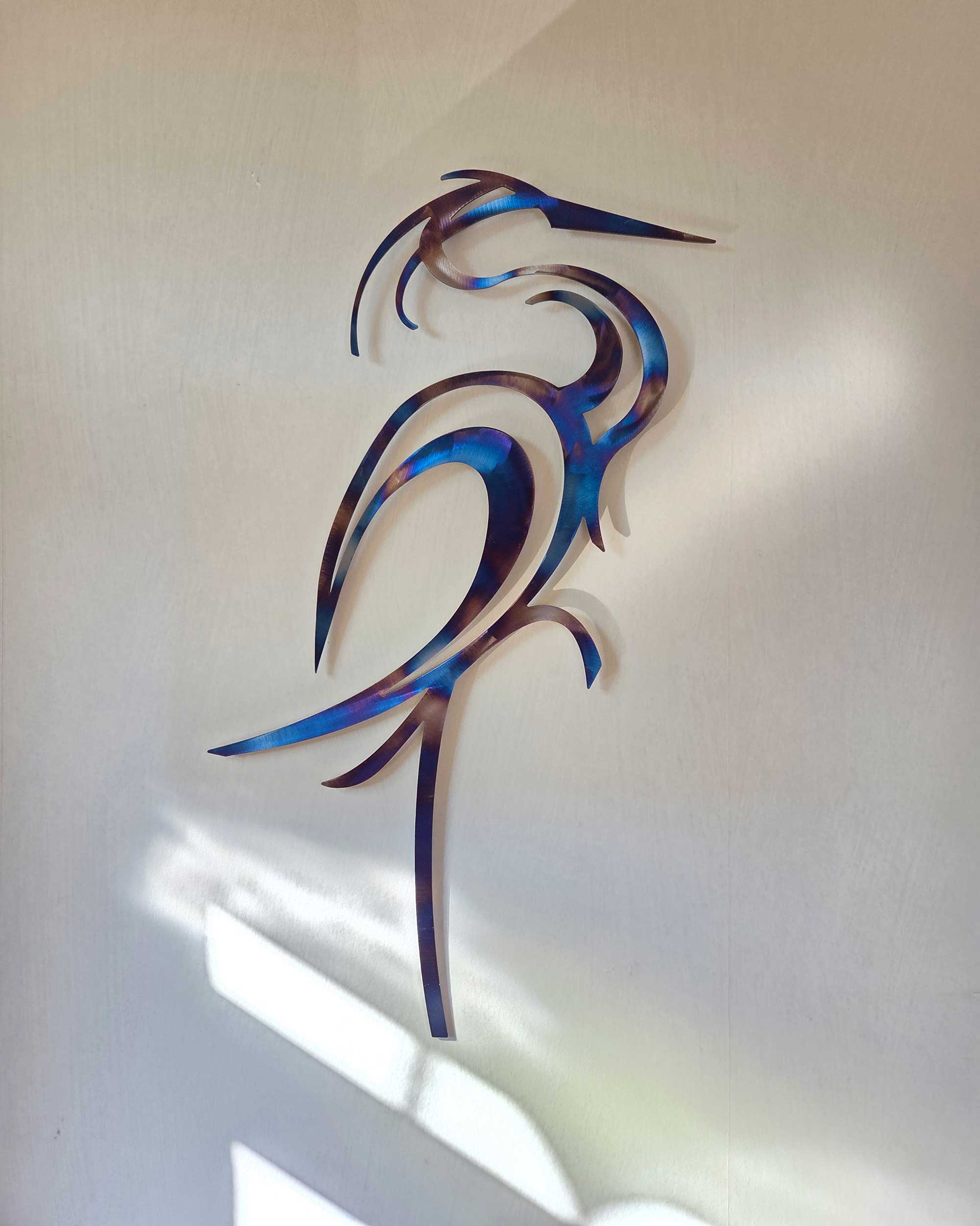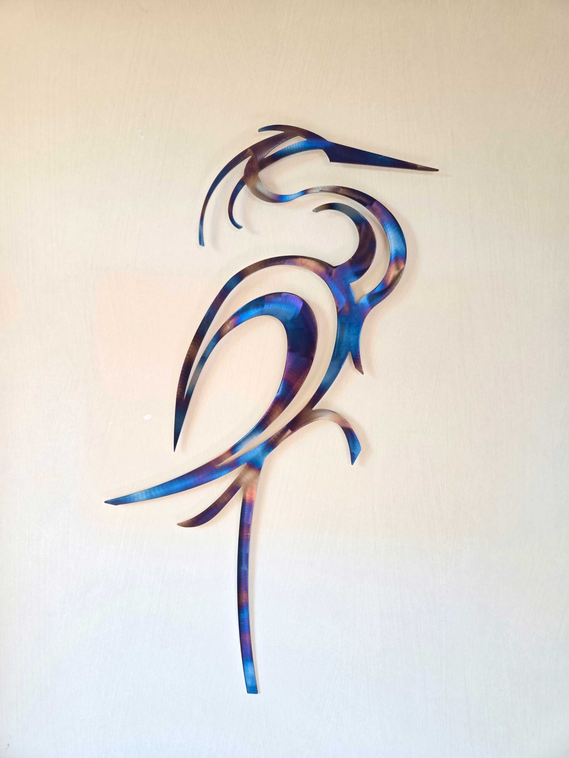 An elegant heron made from laser cut steel with a stunning rainbow patina. This unique eye-catching design would make a beautiful focal point in any room.