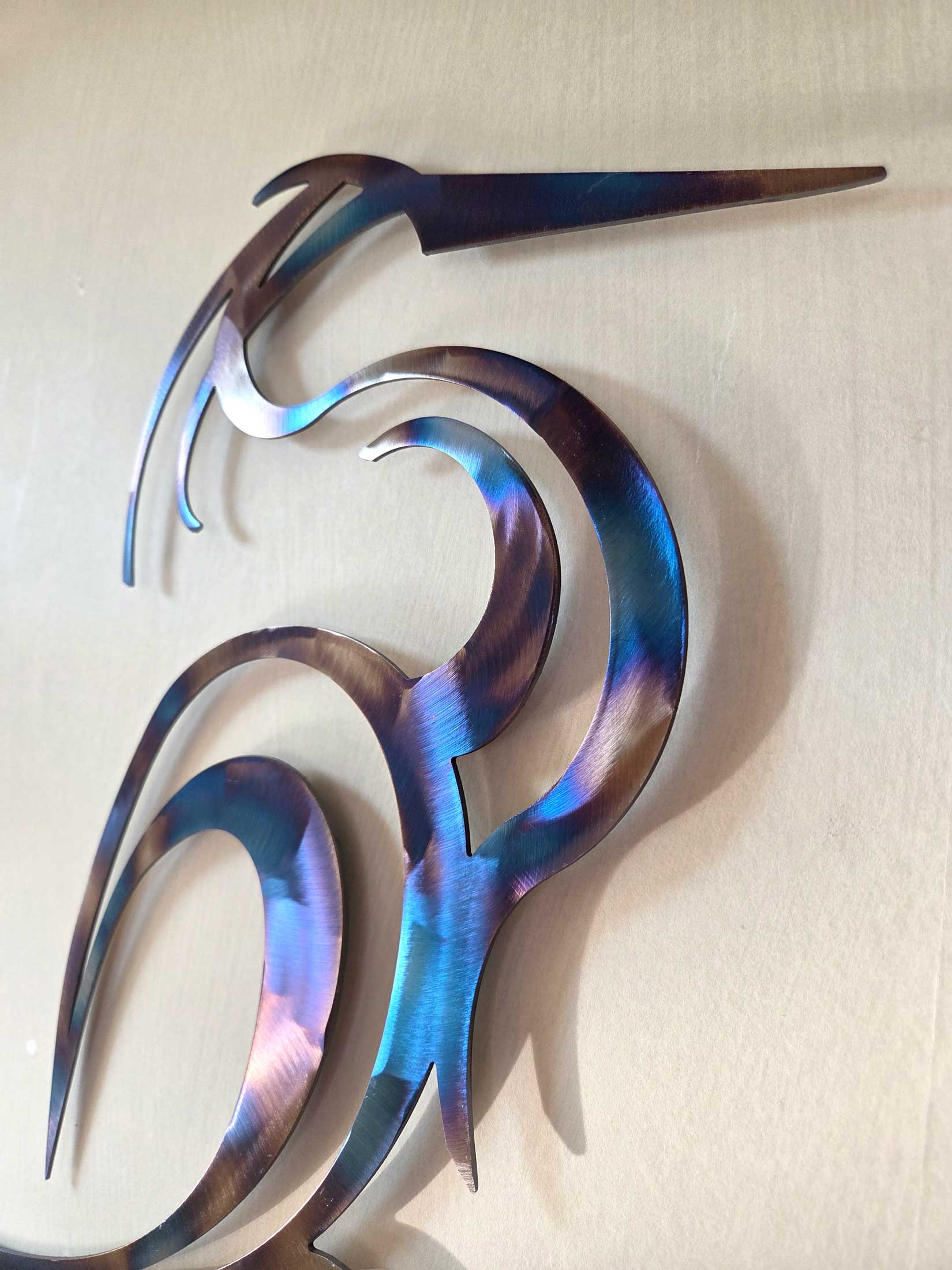 My wall mounted metal art is all made to last from high quality 2 mm steel. To create the iridescent patina I used a gas torch to temper the metal. It’s an amazing process, like painting with fire. Each piece is completely unique. I then apply a layer of clear acrylic spray to seal and protect the surface.