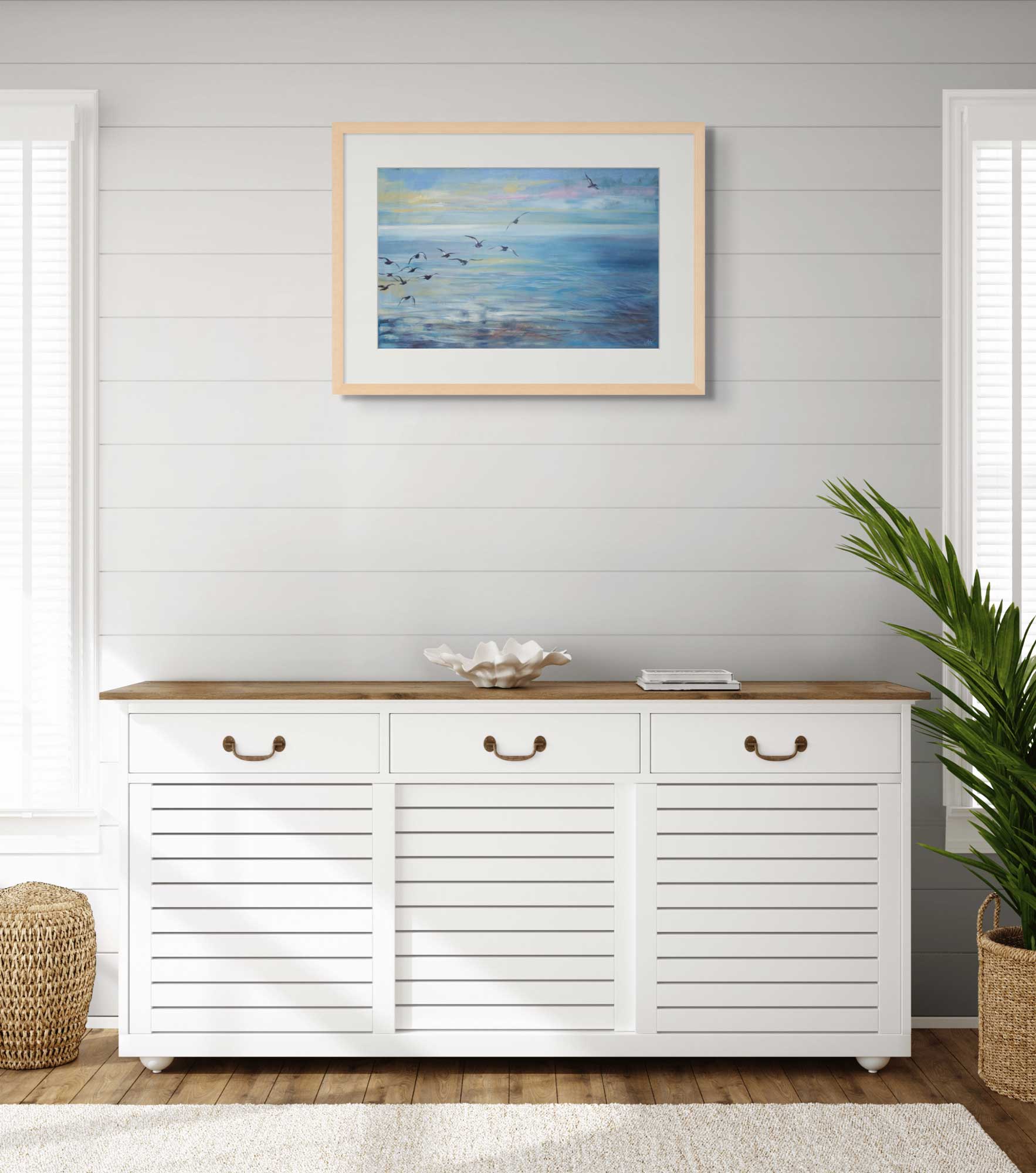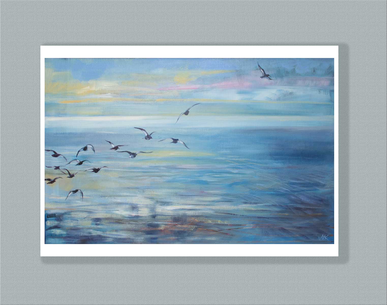 This limited edition Giclee print is a high quality reproduction of an oil painting showing a flock of oystercatchers at Cockersands, Morecambe Bay. I love to walk here and watch and sketch the birds. On this occasion, the mudflats were glinting with all the colours of a beautiful late afternoon sky.