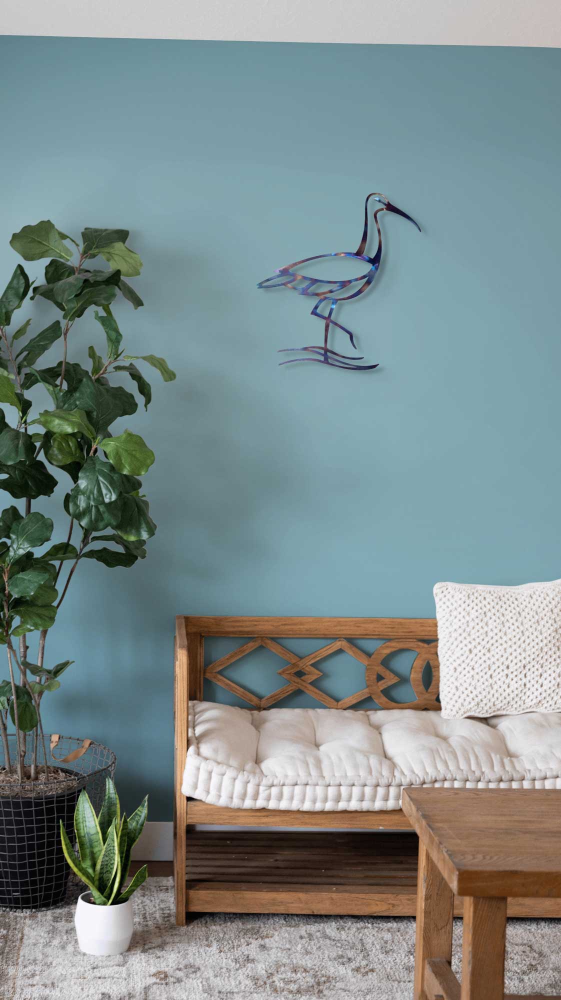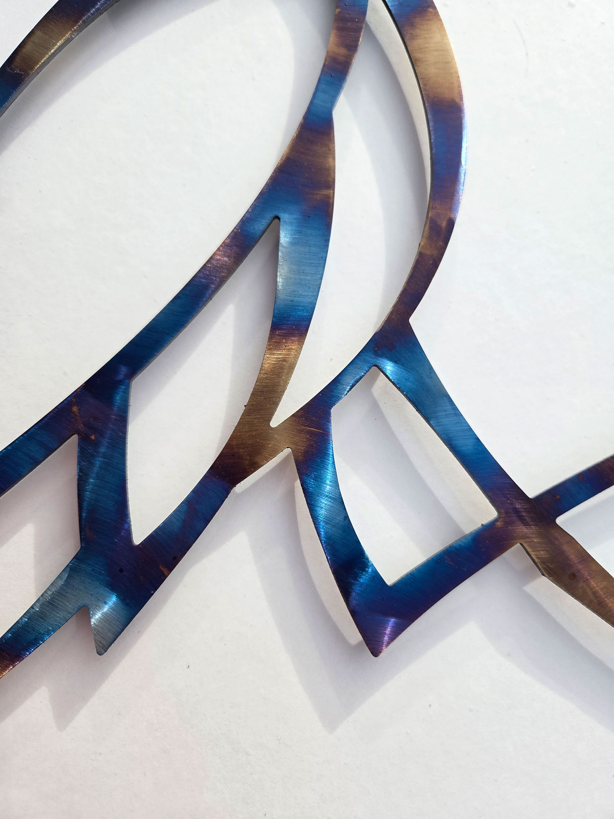 My wall mounted metal art is all made to last from high quality 2 mm steel. To create the beautiful patina on this design I used a gas torch to temper the metal. It’s an amazing process, like painting with fire. Each piece is completely unique. I then apply a layer of clear acrylic spray to seal and protect the surface.