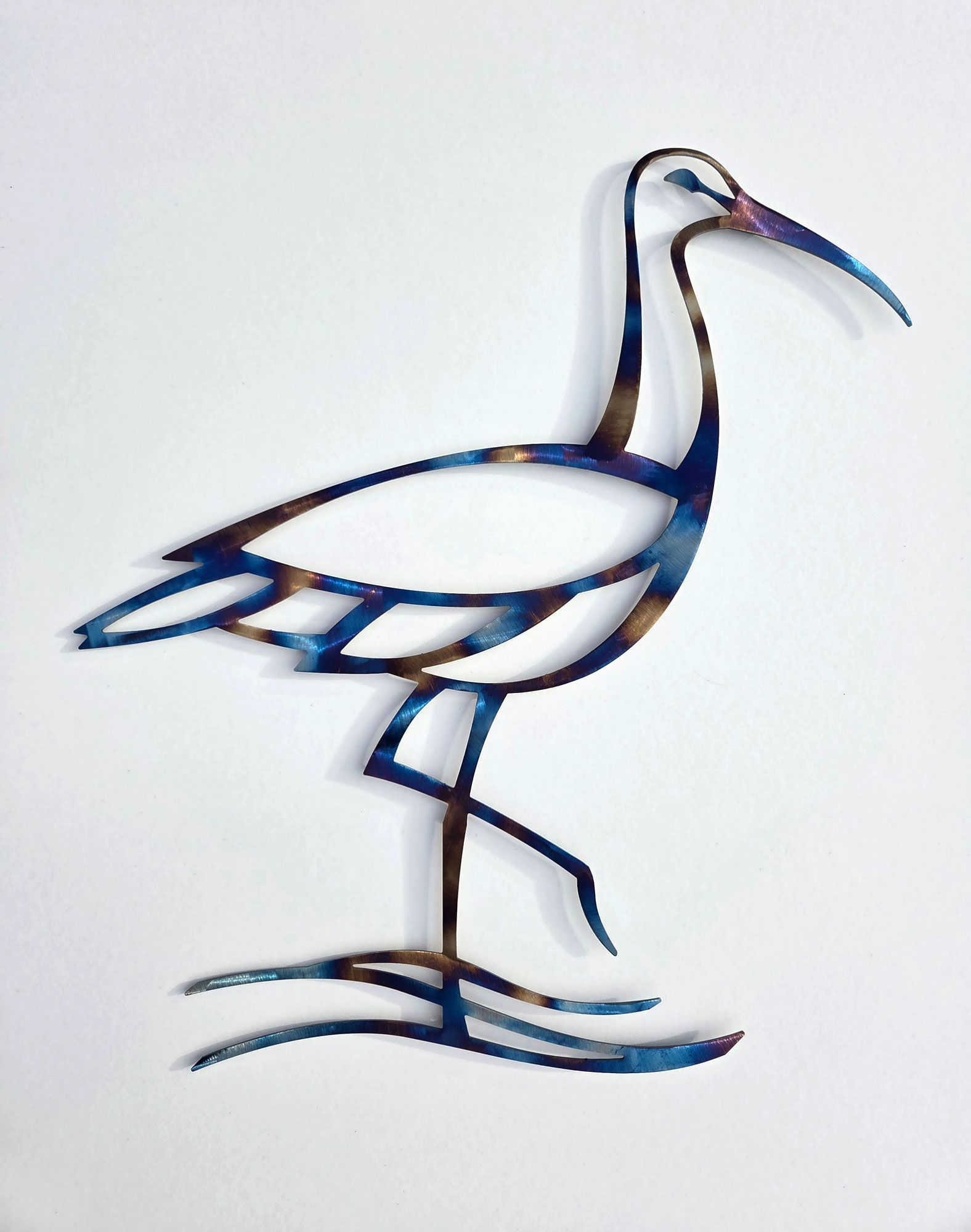 A curlew made from laser cut steel which has been heat tempered to give a beautiful rainbow effect. This design was made to complement my first curlew, which can be viewed here. Curlews are flock birds and love company!