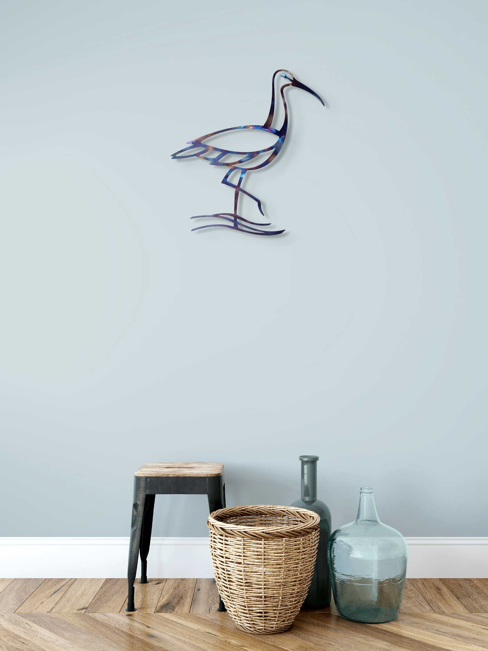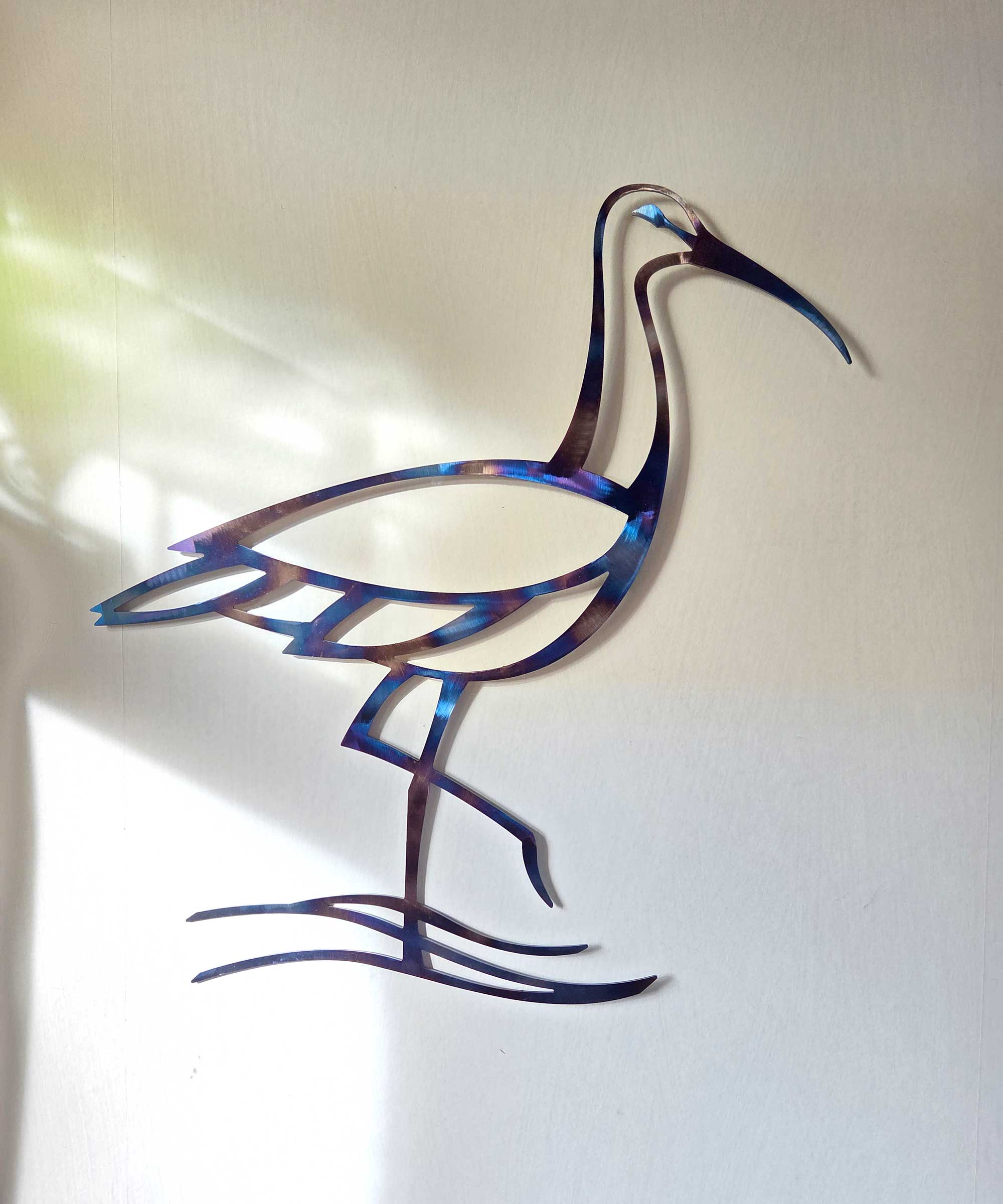 In order to ensure the longevity of the rainbow patina it is recommended to keep my heat treated designs indoors. I can also make the curlew design in sealed rusted steel, or stainless steel, both of which are perfectly durable outdoors.