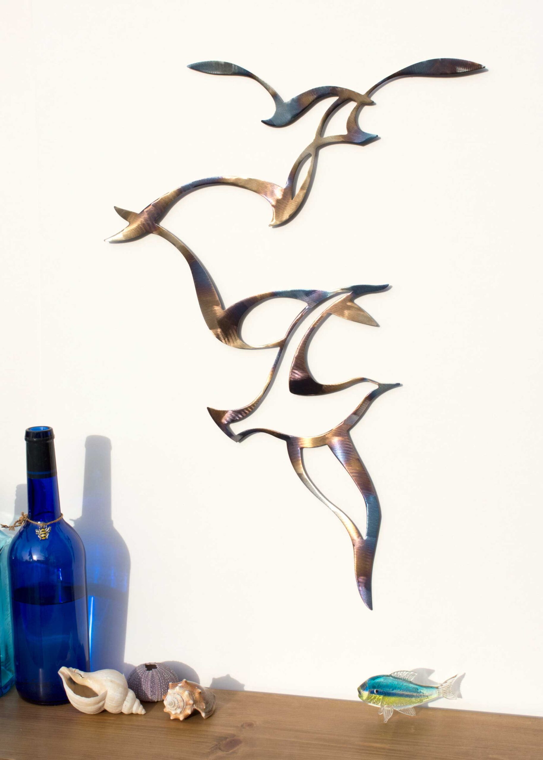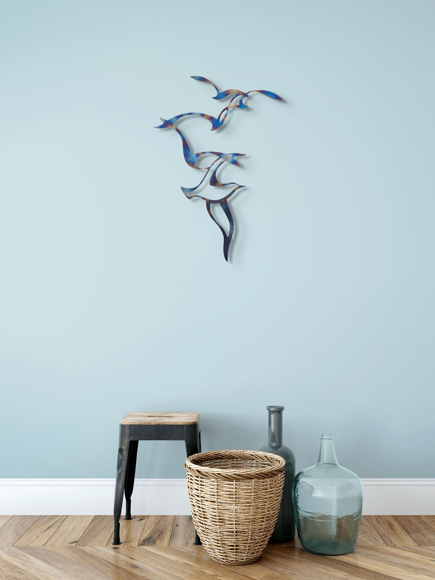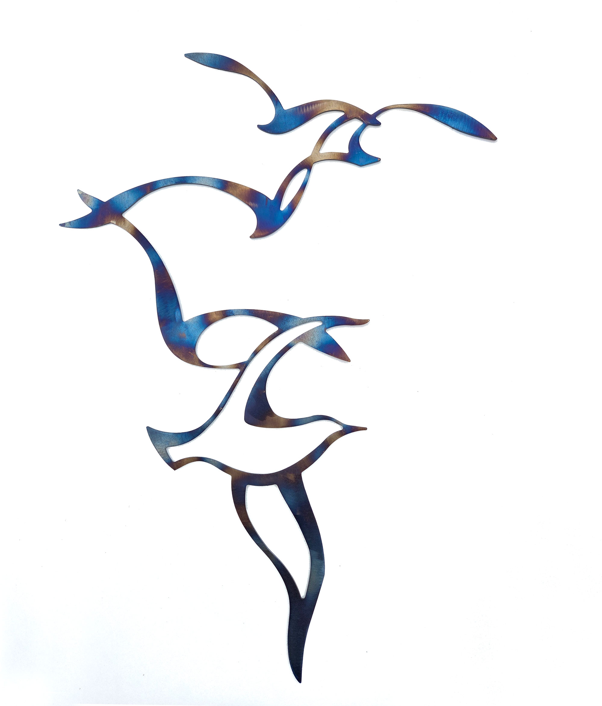 In order to ensure the longevity of the rainbow patina it is recommended to keep my heat treated designs indoors. I also make the seagull design in sealed rusted steel, or stainless steel, both of which are perfectly durable outdoors.