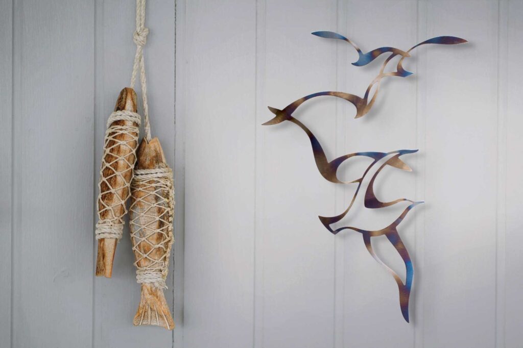An iridescent metal seagull design made from steel with a shining rainbow coloured patina.